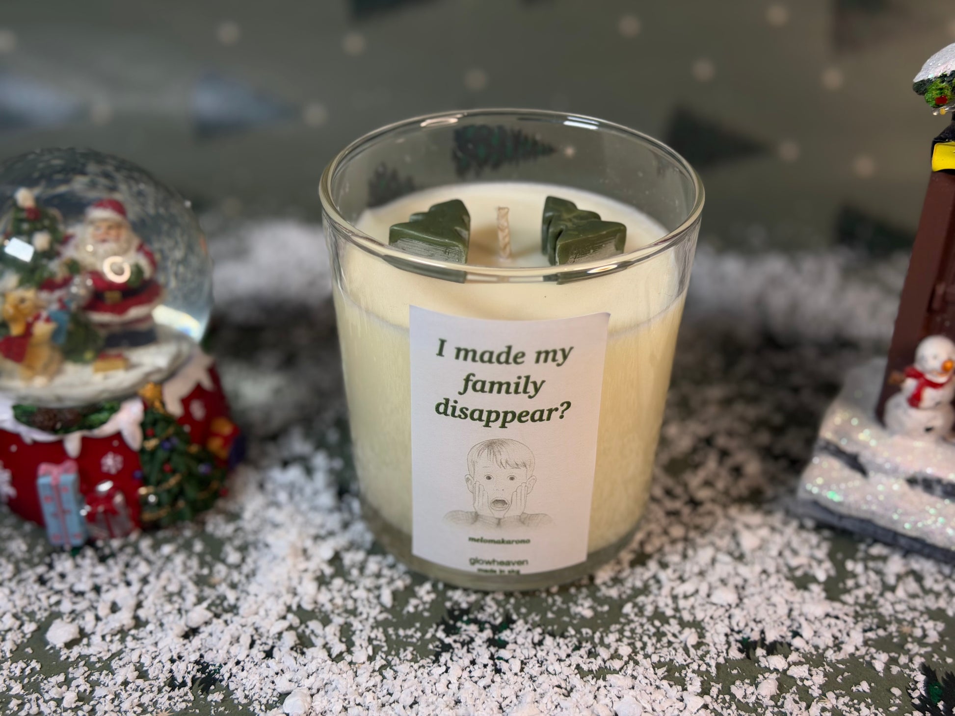 Το I made my family disappear? (240gr) της GlowHeaven είναι χειροποίητο κερί σόγιας με άρωμα μελομακάρονο — γλυκό, μελωμένο και γεμάτο ζεστασιά, όπως οι στιγμές των γιορτών στο σπίτι.