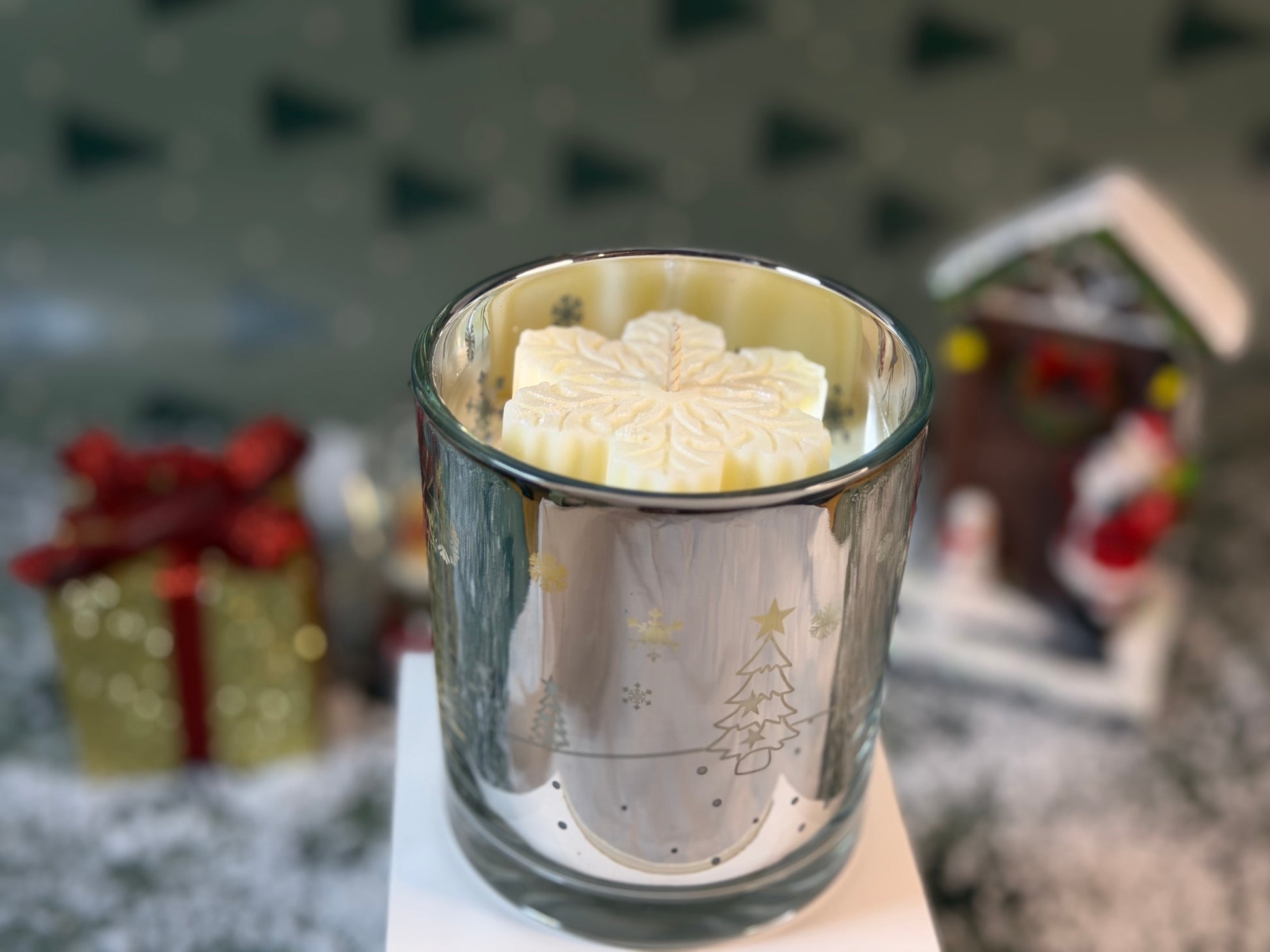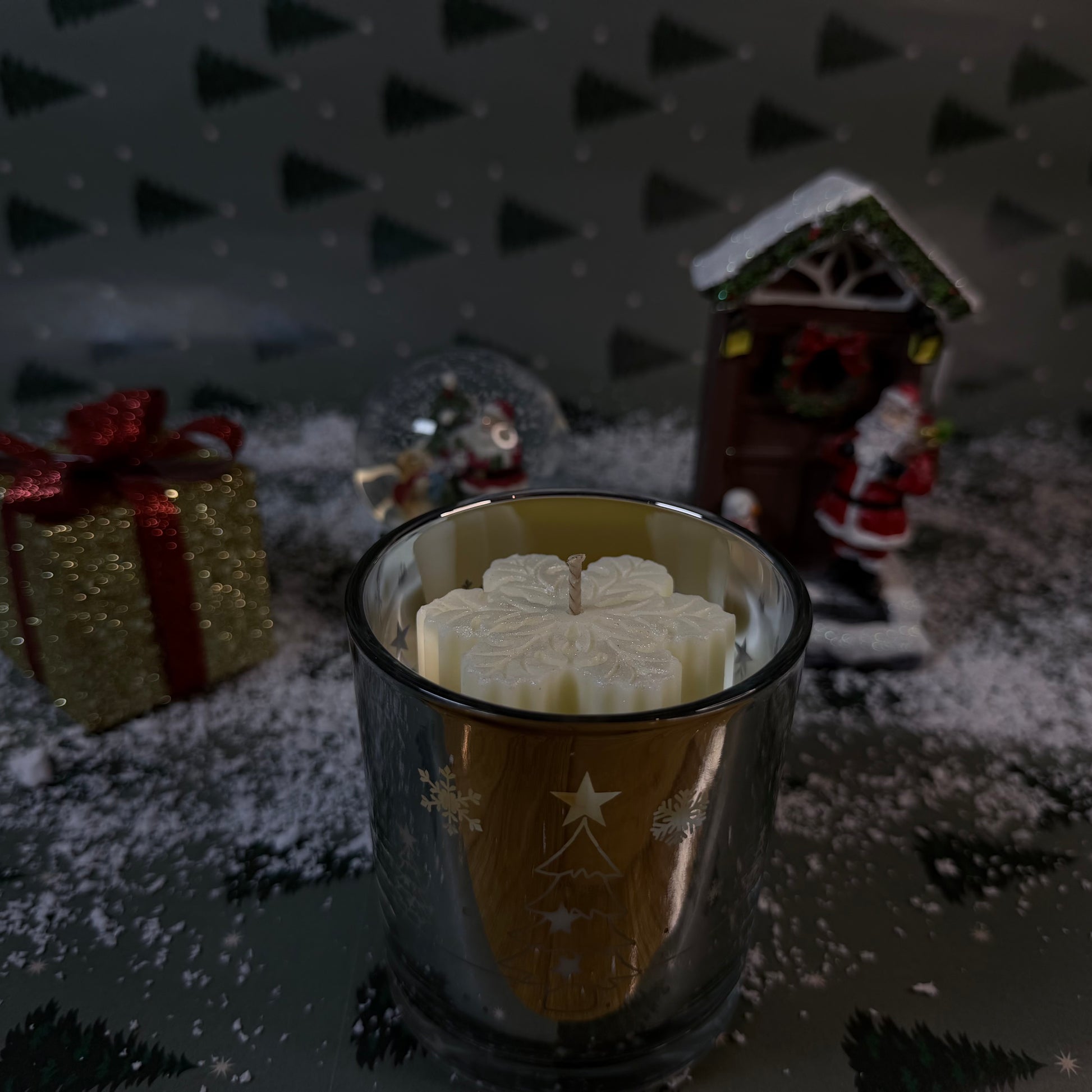 Χειροποίητο, από φυσικό κερί σόγιας, σε γυάλινο δοχείο με festive σχέδιο και χιονονιφάδα με glitter στην κορυφή.